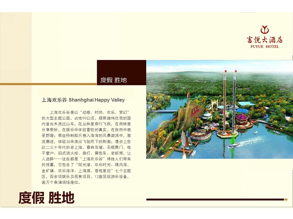 上海富悦大酒店按照是一家超大型商务会议度假型酒店。位于上海市松江新城国际生态商务区。酒店毗邻沪杭高速、沪渝高速、沈海高速公路,距离虹桥国际机场仅30分钟车程,距离浦东国际机场1个小时车程,交通便利,地理位置优越。紧邻万达广场、佘山国家森林公园、上海影视乐园、上海欢乐谷、玛雅水世界等风景名胜区。 酒店总建筑面积10.5万平方米,拥有上海第一大堂,拥有各类豪华客房1000间套,宽敞豪华的大开间、通透舒适的落地玻璃窗、风格时尚的卫浴设计、细心周到的贴身管家、无微不至的用心服务、豪华温馨的客房设施,将带给宾客美妙的感受。 酒店拥有极其完善和现代化的会议场所及设施,配有两个层高8米、一个面积2300平方米、一个面积2000平方米的无柱多功能厅;一个层高5米、面积1400平方米宴会厅;一个层高6米、面积550平方米宴会厅;还配有10多个不同规格的中小会议室,是目前上海地区同类酒店中规模最大、设施最完善的会议中心之一,满足宾客高档商务会议、会展、婚宴的一切所需。大小不一的会场,总有一款适合你。 酒店还拥有各类餐厅。 42个风格迥异的豪华中餐包厢,为宾客精心提供精品粤菜、杭邦菜、各类海鲜珍品、高档燕鲍翅。拥有高档咖啡厅、自助餐厅。缤纷多彩的美食全方位诠释时尚奢华生活,为宾客营造出尊贵的顶级就餐空间。另外,酒店大型KTV、足浴中心、棋牌中心、室内游泳池、健身中心、儿童乐园等康体娱乐设施更是一应俱全,为宾客量身定制专属的放松空间。 商务之家,会议天堂,度假胜地,上海富悦大酒店将为商务、会议、会展、度假、休闲、婚宴客人提供无与伦比的消费体验。 上海富悦大酒店销售热线:江先生 18917117133 (酒店销售总监) 此联系方法为酒店直销,无中间商。 |